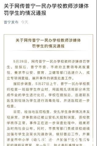 该事件流传开来后,引起了当地市委、市政府的高度重视,并成立了专项调查组对该事件进行进一步调查。5月29日,普宁发布在其官方平台发出事件情况通报。通报中显示,该事件经过了初步调查,确认在5月27日上午,普宁的一所民办学校内,确有一名教师在检查班级学生作业时,用圆规扎了一些没有完成作业的学生,以其作为处罚方式。目前,被扎的学生已经被送往医院进行检查,身体状况暂无大碍,涉事教师也已被当地公安机关进行控制调查,学校将与家长和学生进行沟通协调,做好善后工作。该事件调查结果将及时向社会公布。