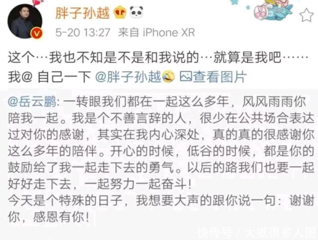 岳云鹏“520”发文表白孙越,要知道初中文化的岳云鹏,一般发动态都不超过二十个字,能写出这么多字来,也确实是对搭档孙越的感恩。喜欢相声的网友都知道,相声分为单口相声、对口相声、群口相声,我们常见的相声是对口相声,对口相声搭档之间的关系非常“亲密”,找一个契合自己的搭档不容易,所以,搭档关系一旦行成,他们彼此就成了对方 “最重要的人”。