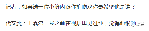 不过肖战粉丝大可放心,因为在之前的采访里,代文雯表示自己最想和王嘉尔拍吻戏,大概不会对你们的肖战哥哥动心(没有说肖战不好的意思)?