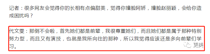 被问到撞脸赵丽颖等人会不会觉得困扰的时候,代文雯也看得很开,坦言自己很尊重前辈,并且会学习她们有演技又努力的样子。