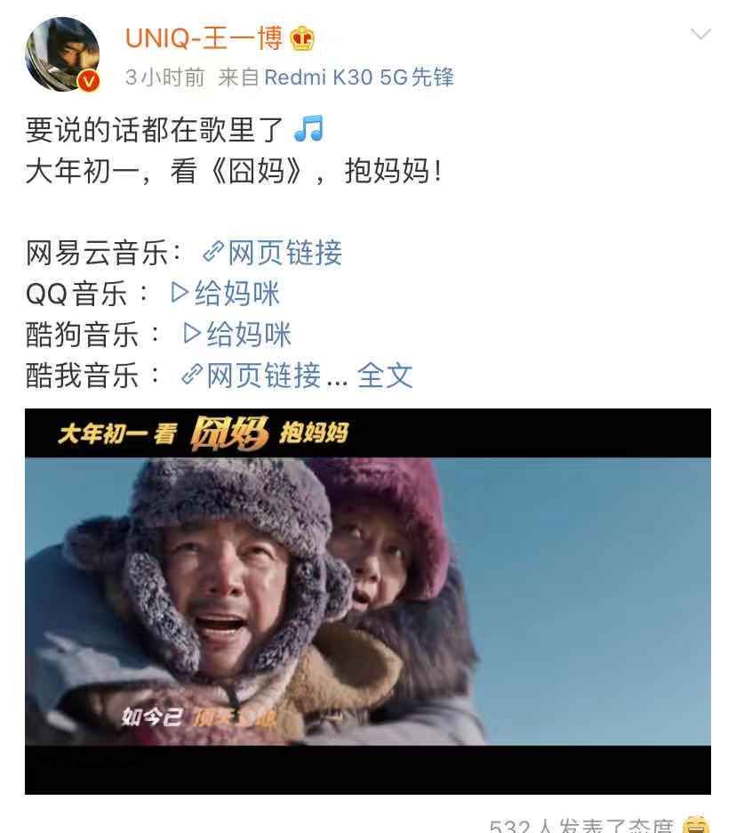 王一博能够演唱这部电影的主题曲,算是以另一种方式加盟了《囧妈》这部电影。春节时,这部电影大爆的可能性很大,到时候王一博也会因此获得一些关注度吧!也难怪山争哥哥前几天会发和王一博的合影,原来两人早早的就已经有了合作。