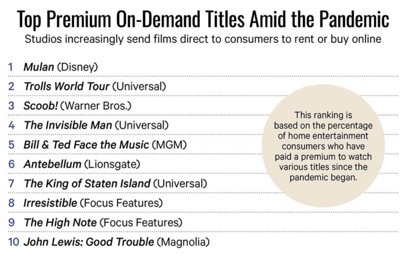 我们看到的是,好莱坞已经超越了早期采用者的早期阶段,开始大规模进入皮皮影音市场。越来越多的工作室选择了这种模式,电影的类型也越来越丰富。在中国市场,越来越多的电影走向皮皮影音。例如,由郭敬明执导、耗资7亿元的《花木兰》,已经放弃影院,转而选择流媒体。